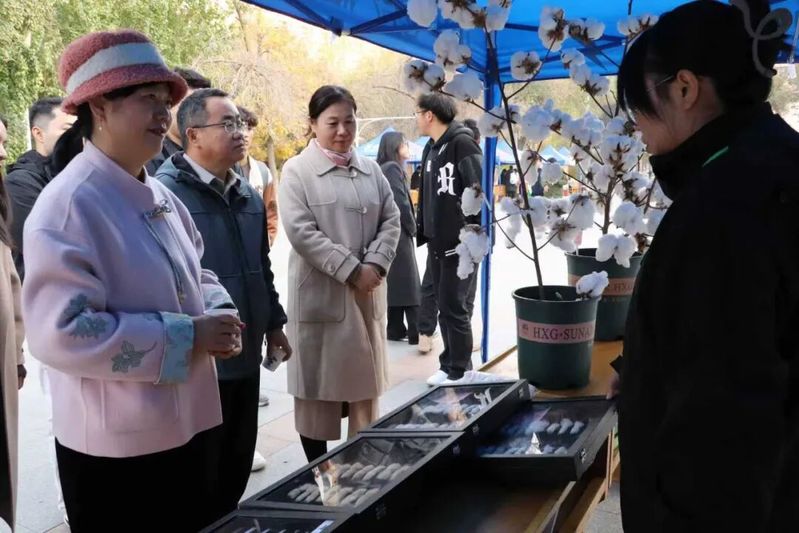 洁白如雪的新疆长绒棉与精致棉制品相映成趣,不少同学在这里第一次了解到“一朵棉花的旅程”。亲手触摸长绒棉的瞬间,有人忍不住感叹:“这分明是大地馈赠的云朵!”