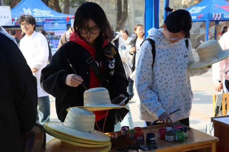 DIY区域始终人气爆棚,同学们在志愿者的引导下制作种子画、绘制草帽。
